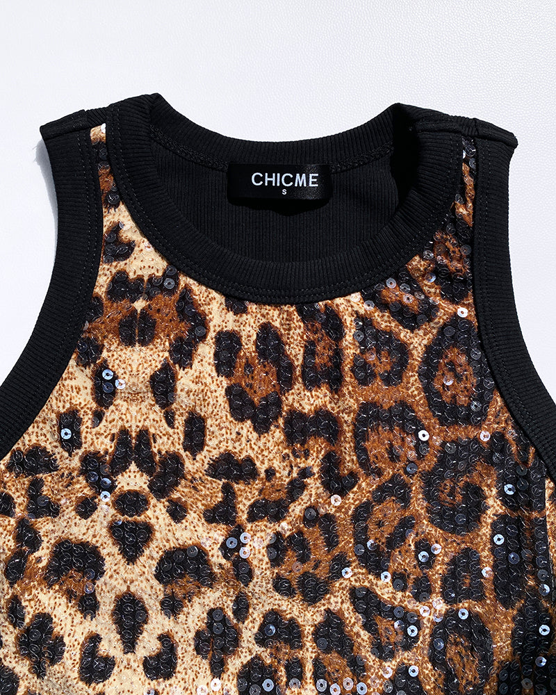 Contrast Sequin Leopard Pattern O-neck Sleeveless Tank Tops Slim Fitted Shirt