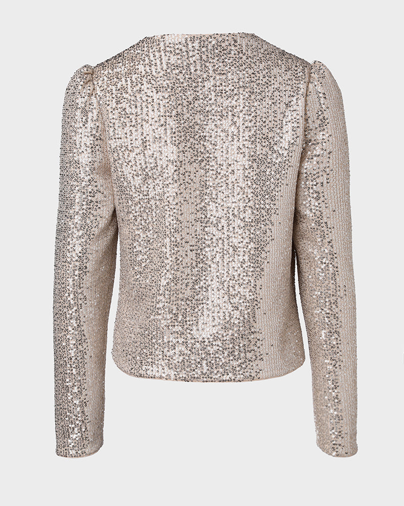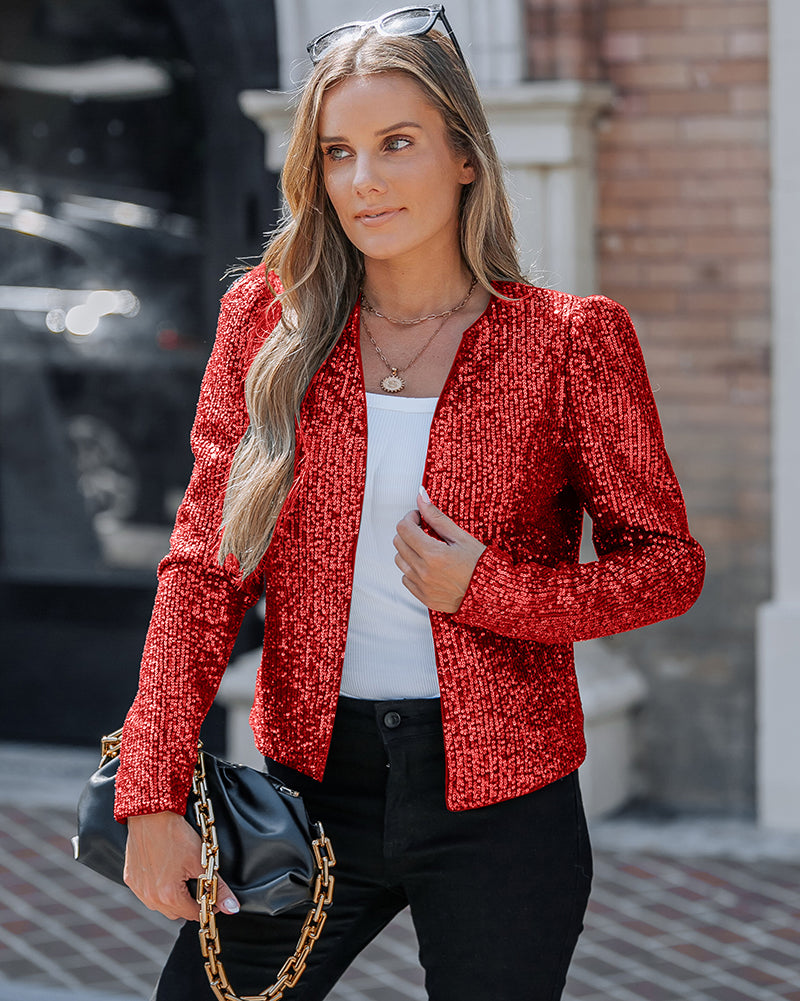 Sparkly Sequin Open Front Puff Sleeve Blazer Coat