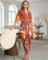 Cable Textured Overlap Deep V-Neck Long Sleeve Mid-Length Dress Tie Waist Slim Fit Knit Dress