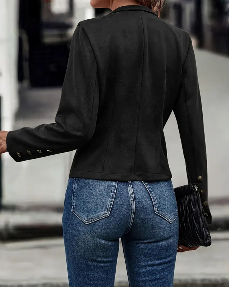 Faux Suede Stand Collar Jacket Open Front Button Decor Casual Coat