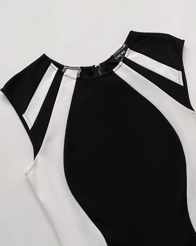 - Stylish Design Details: Features a sleeveless cut and round neckline, bold black and white colorblock panels for a slimming effect, a back slit for mobility, and a zipper back closure for secure wear.