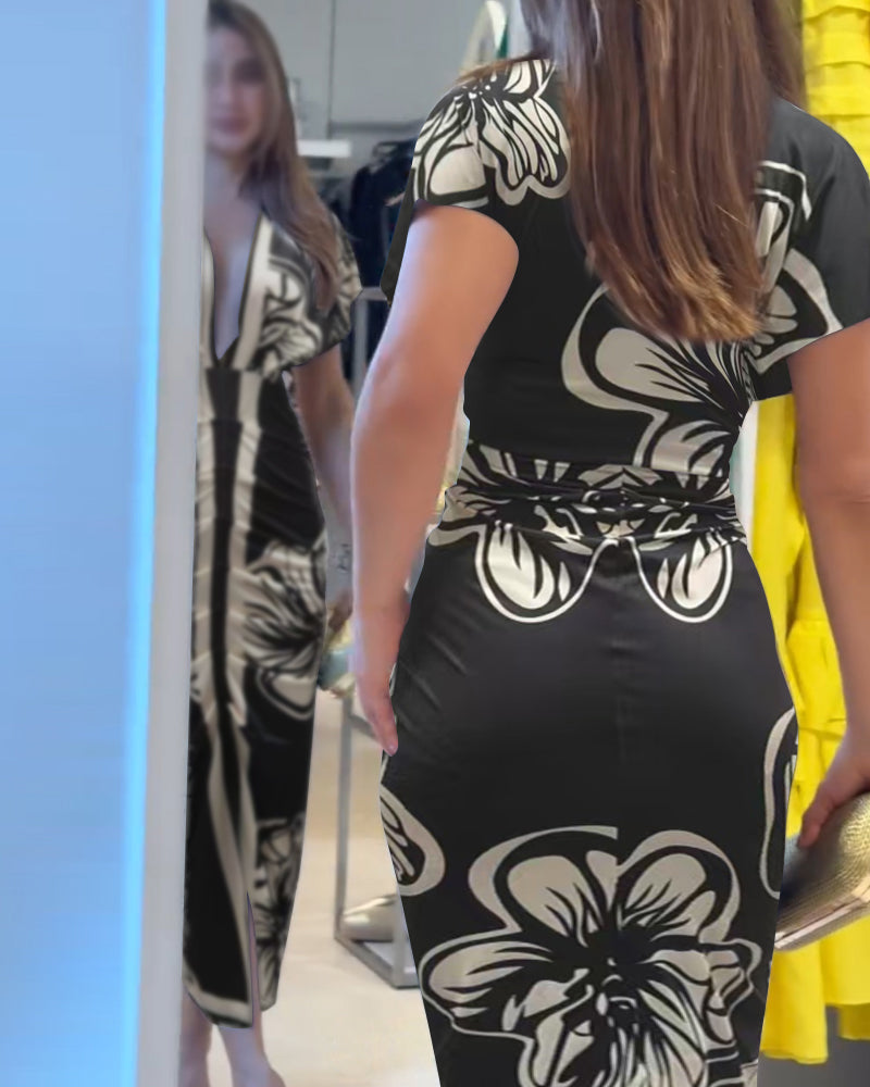 - Design Details: Features a plunging deep V-neckline, short sleeves, ruched waist detail, and a front slit, accented by a vibrant floral print.