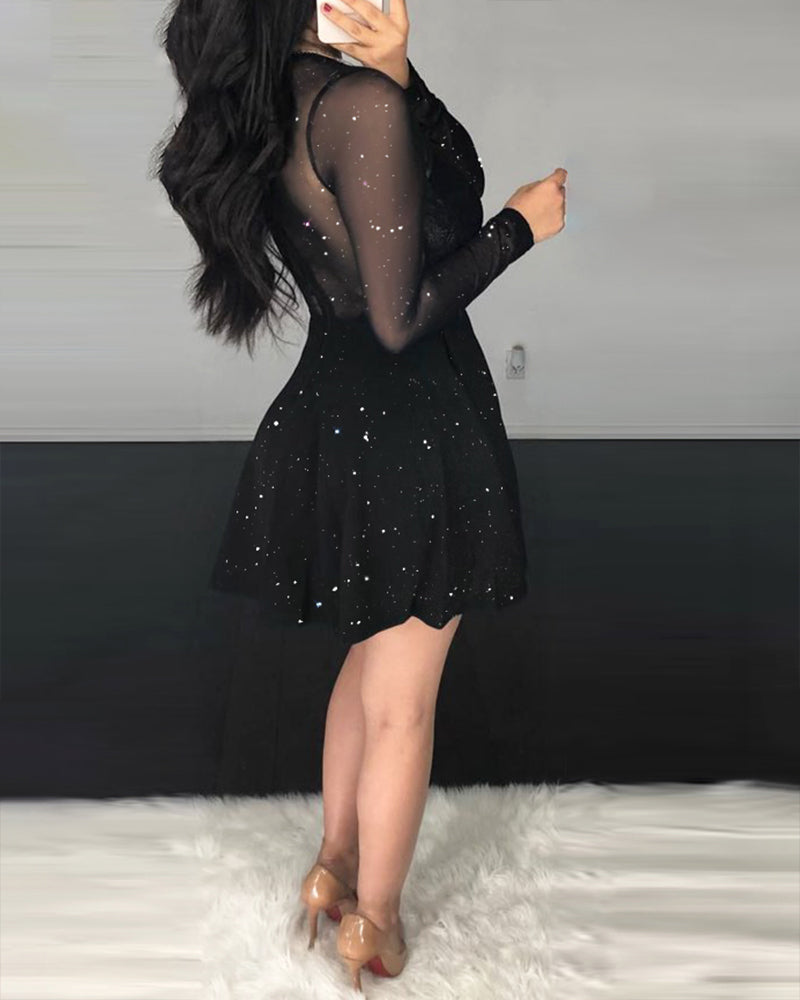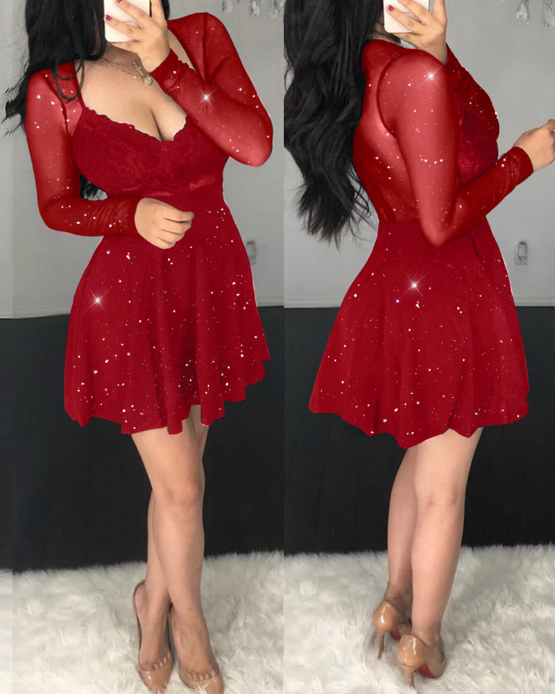 Glitter Sheer Mesh See Through Contrast Lace Long Sleeve Mini Dress Deep V Neck A Line Dresses