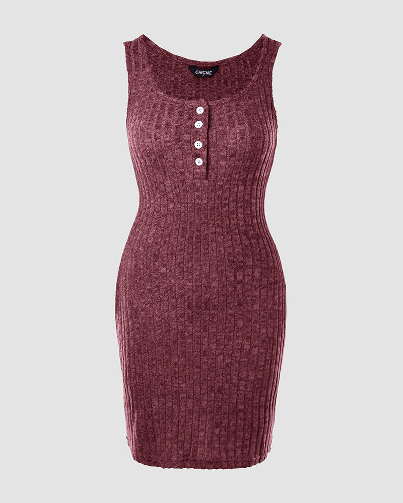 Pocket Design Ribbed Tank Dress Sleeveless Button Front Pullover Bodycon Mini Dresses