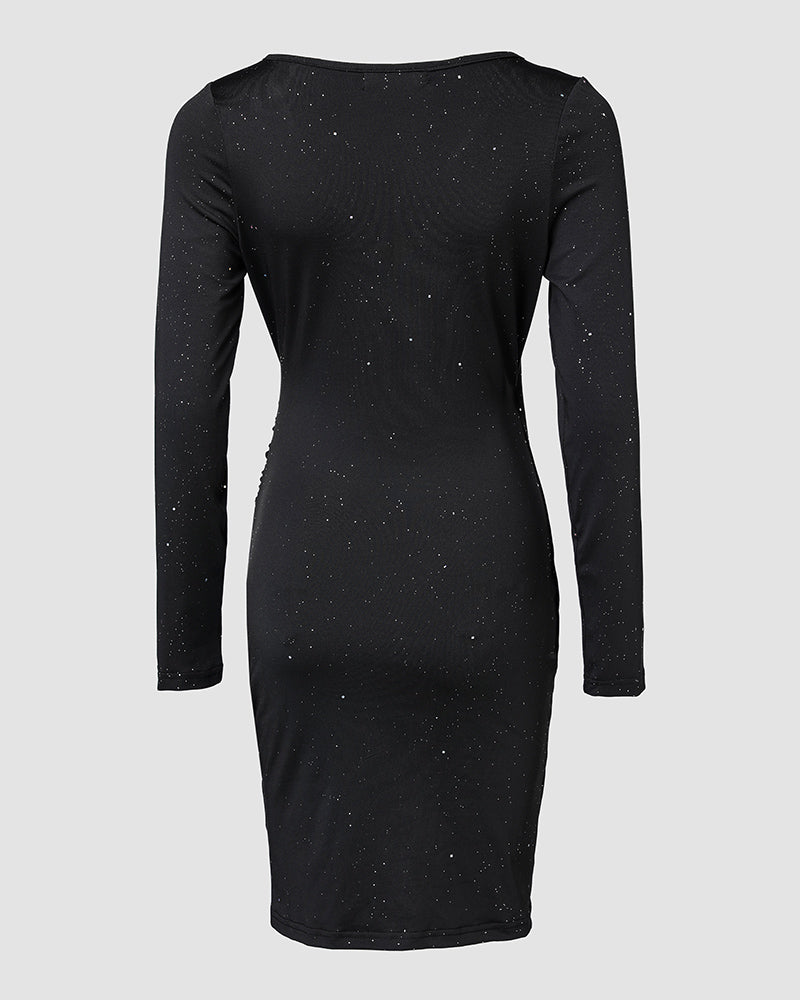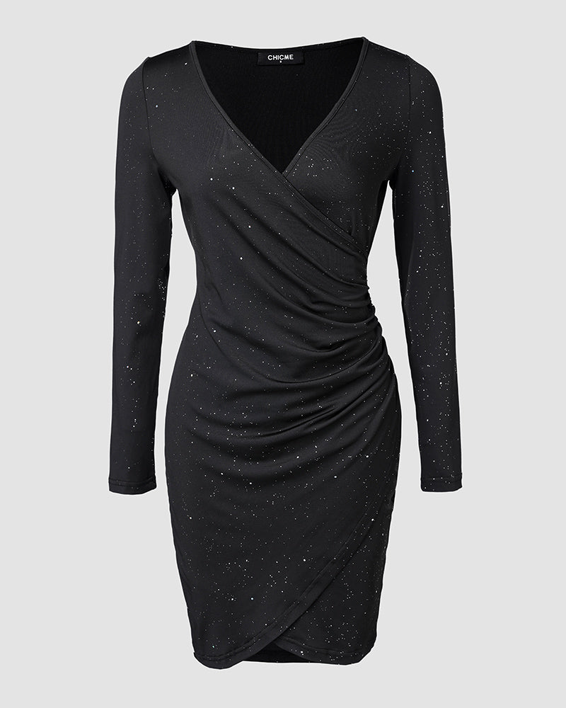 V Neck Long Sleeve Mini Wrap Bodycon Dress Glitter Ruched Cocktail Party Dresses
