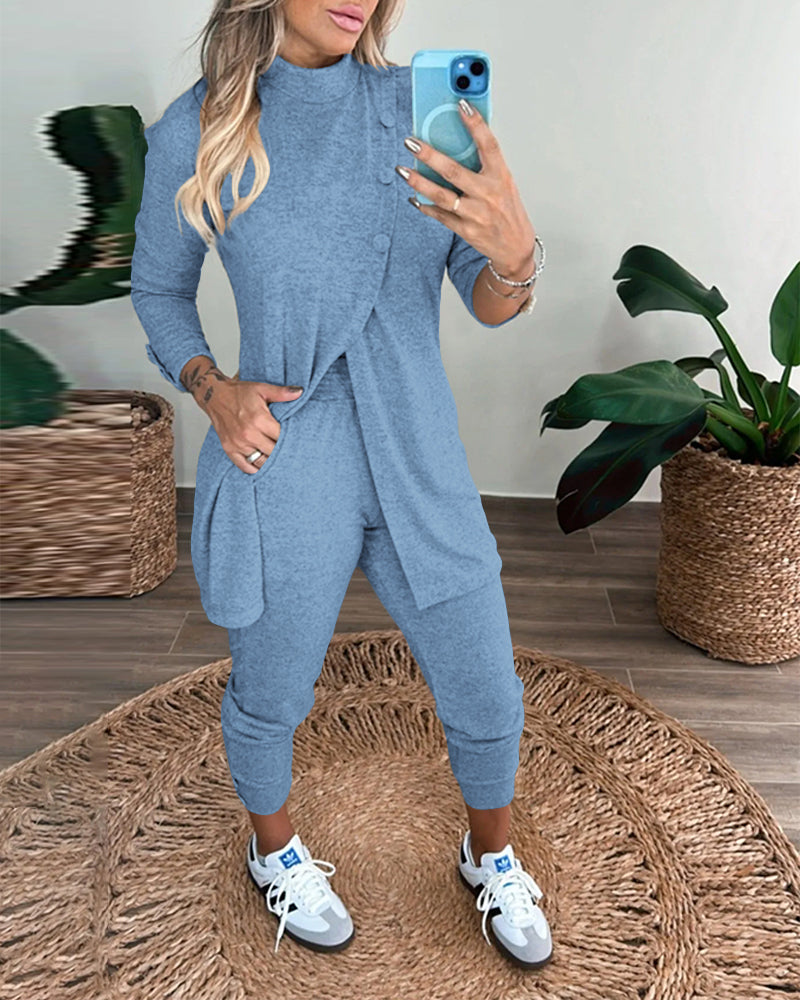 2 Pieces Outfit Mock Neck Long Sleeve Button Decor Slit Mid-Length Top and Stretchy Drawstring High Waist Slim Fit Pants Set