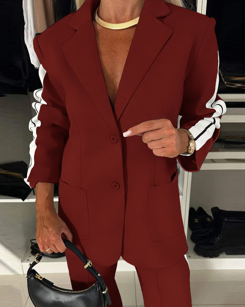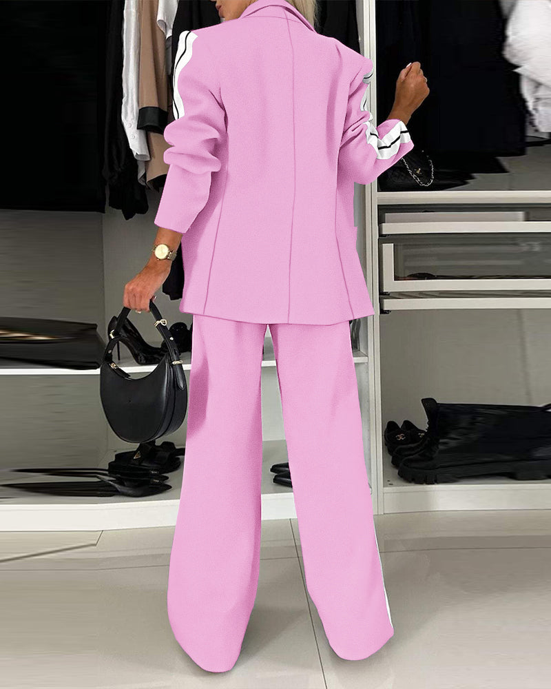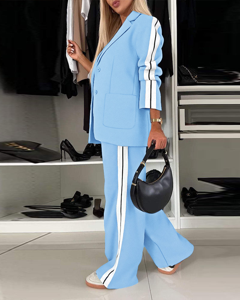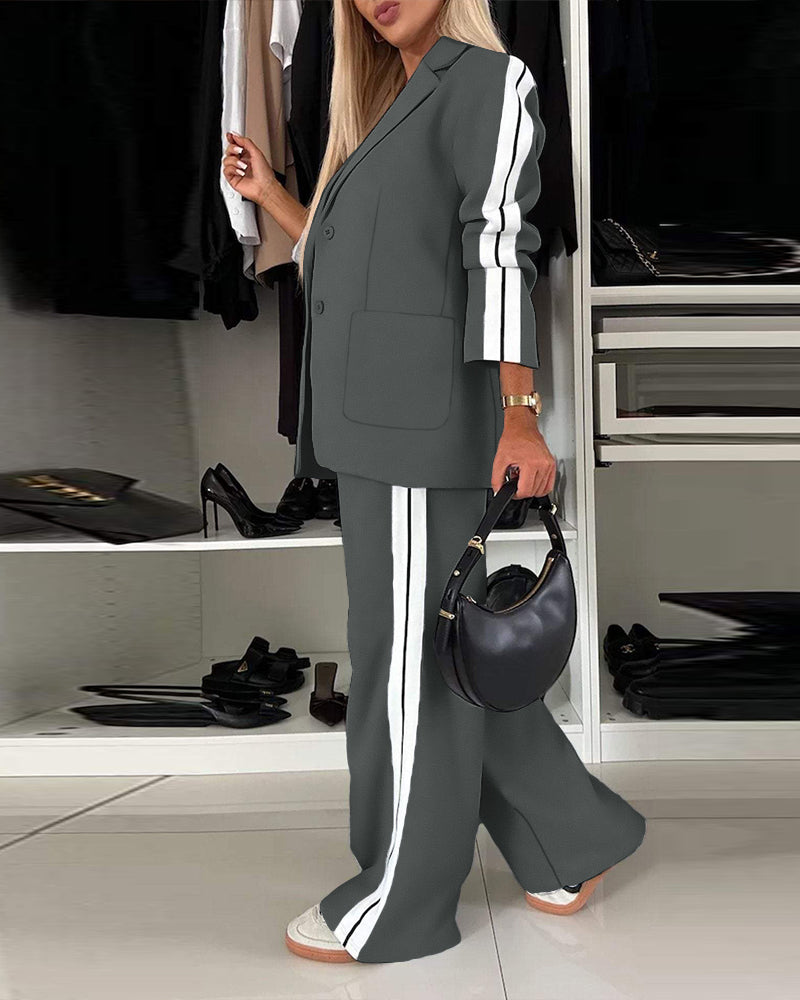 2 Pieces Outfit Notched Collar Single Breasted Pockets Design Coat and Elastic Waist Seam Front Wide Leg Pants Set Casual Contrast Side Striped Blazer Set