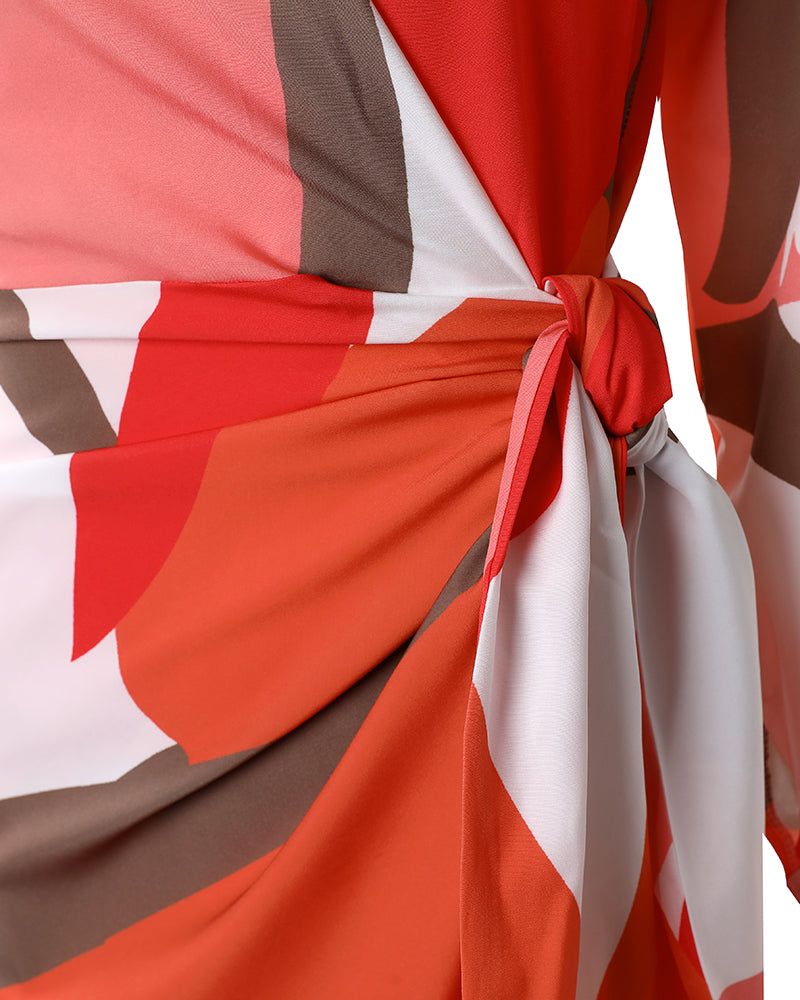 All Over Print Turn-down Collar Tied Detail Dress Casual Ruched Wrap Front Vacation Dress
