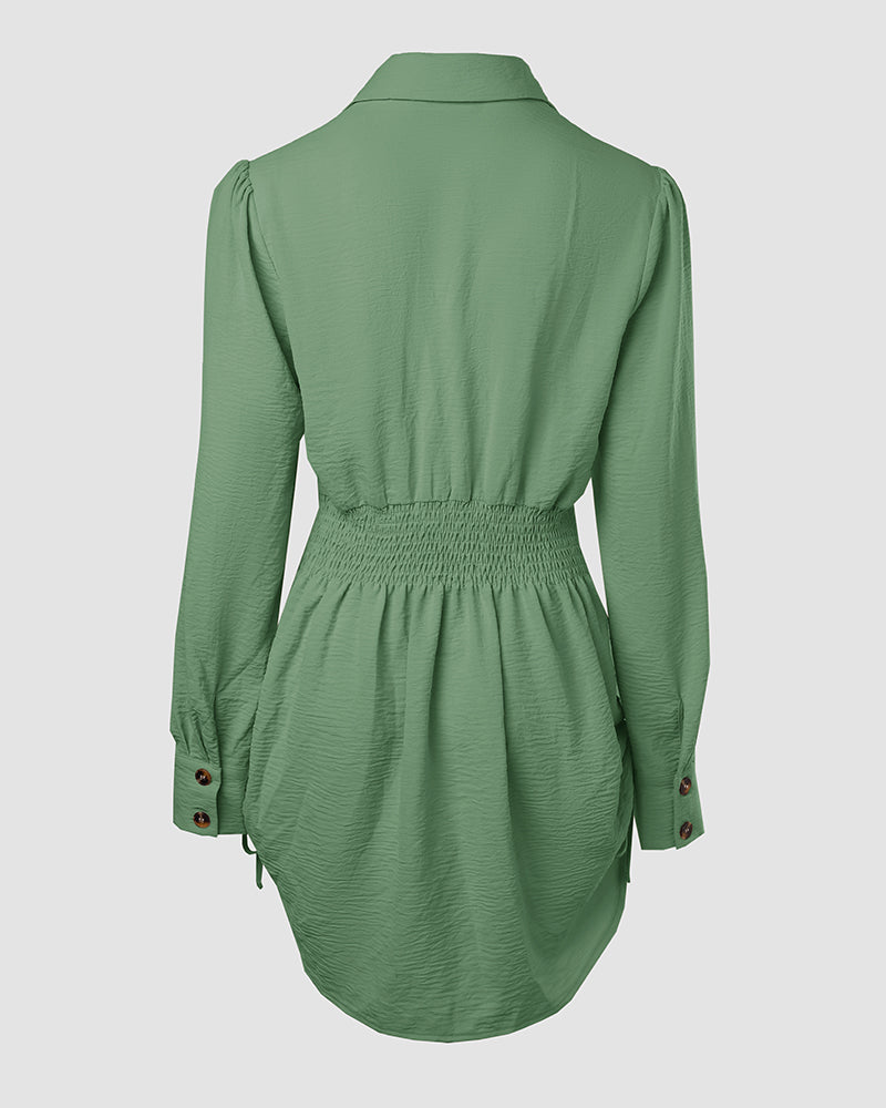 Button Down Shirt Dress Roll Tab Sleeve Side Drawstring Mini Dresses