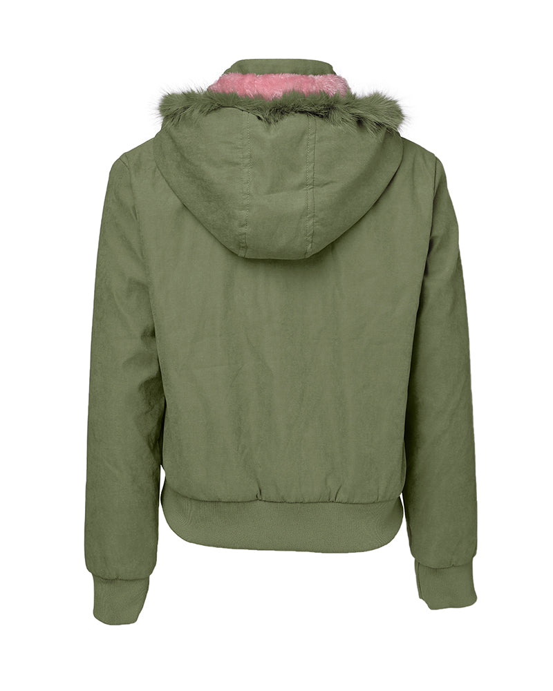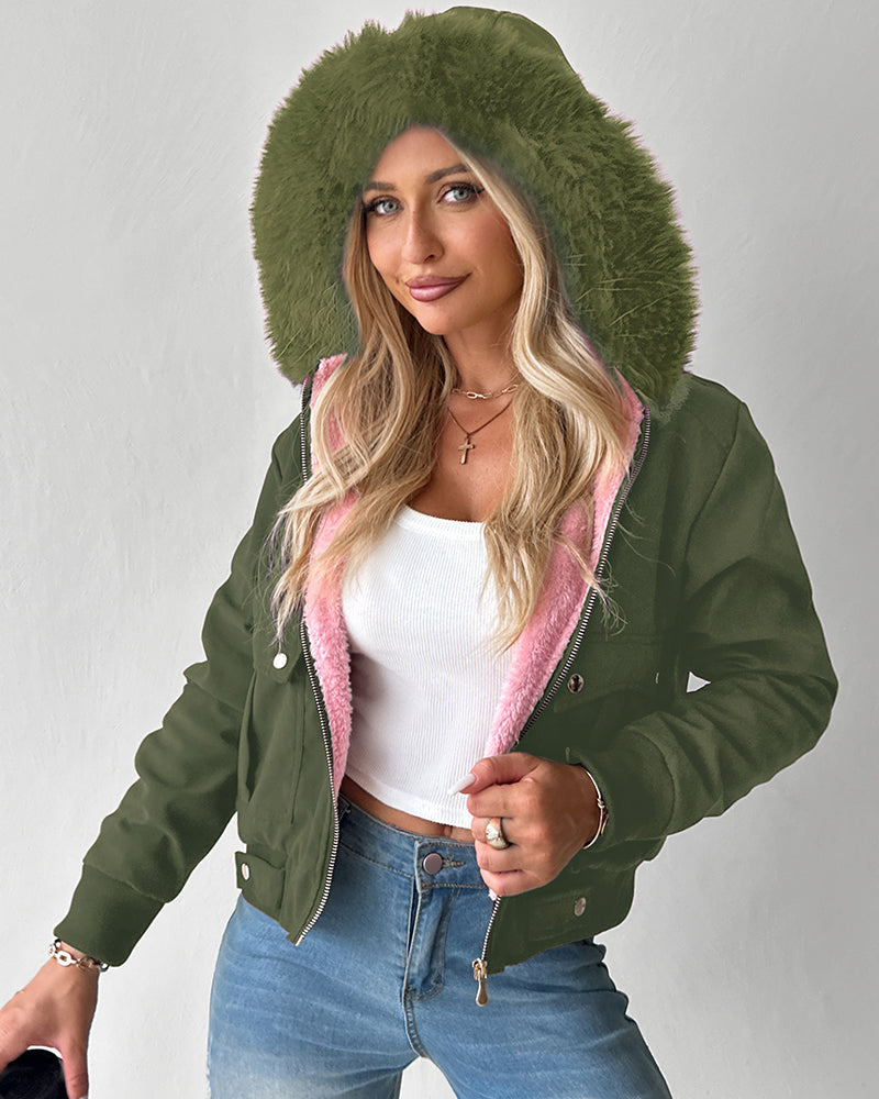 Fuzzy Trim Jacket Hooded Zip Up Fleece Lined Coat Outwear with Pockets