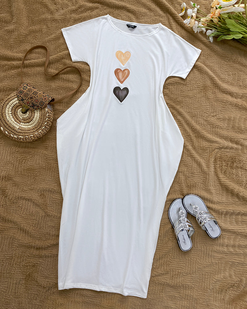 Heart Pattern Cold Shoulder Short Sleeve Maxi Dress Casual Pocket Design Loose Fit Dress