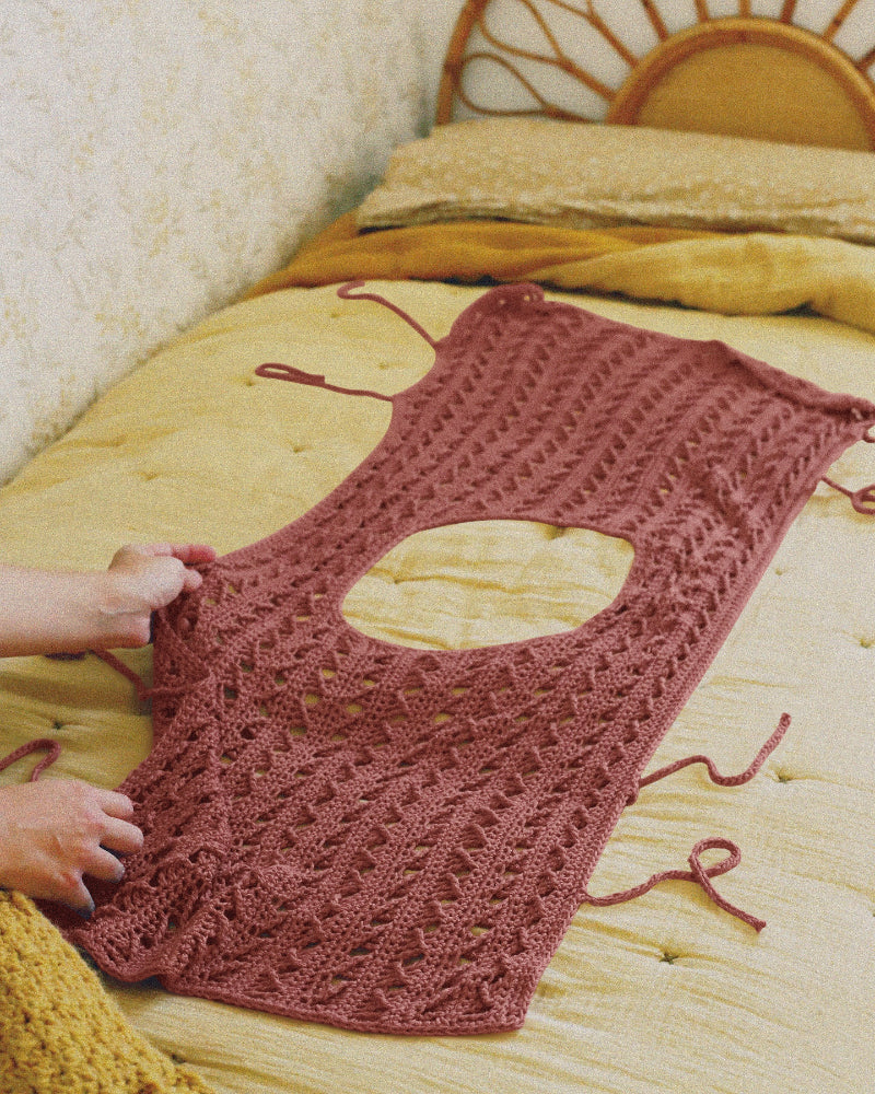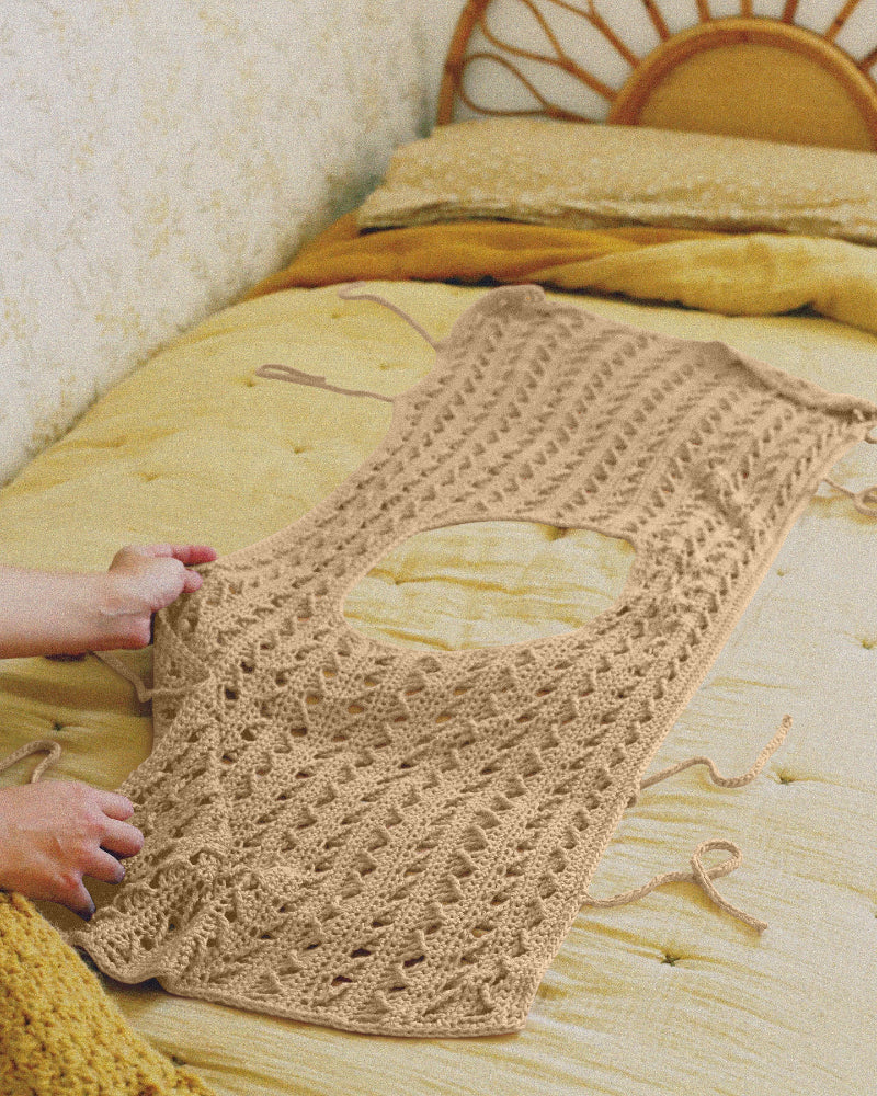- Design Details ¨C Round neckline frames the collarbone, hollow-out crochet texture adds airy detail, and tie-side feature allows adjustable fit.