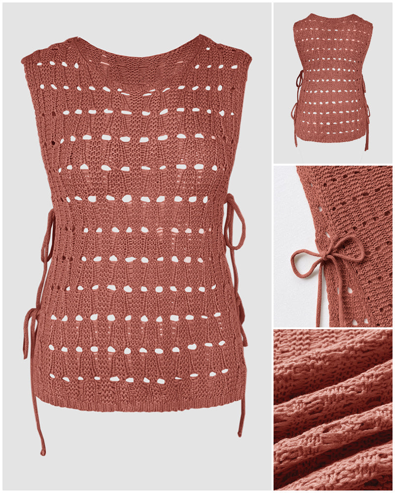Round Neck Sleeveless Hollow-out Crochet Sweater Casual Tie Side Breathable Crop Top