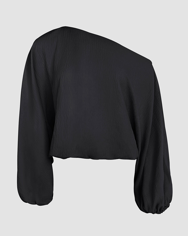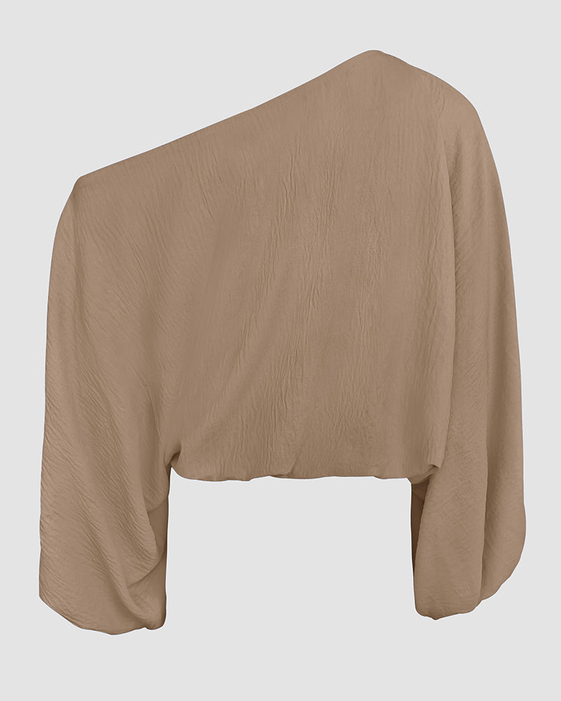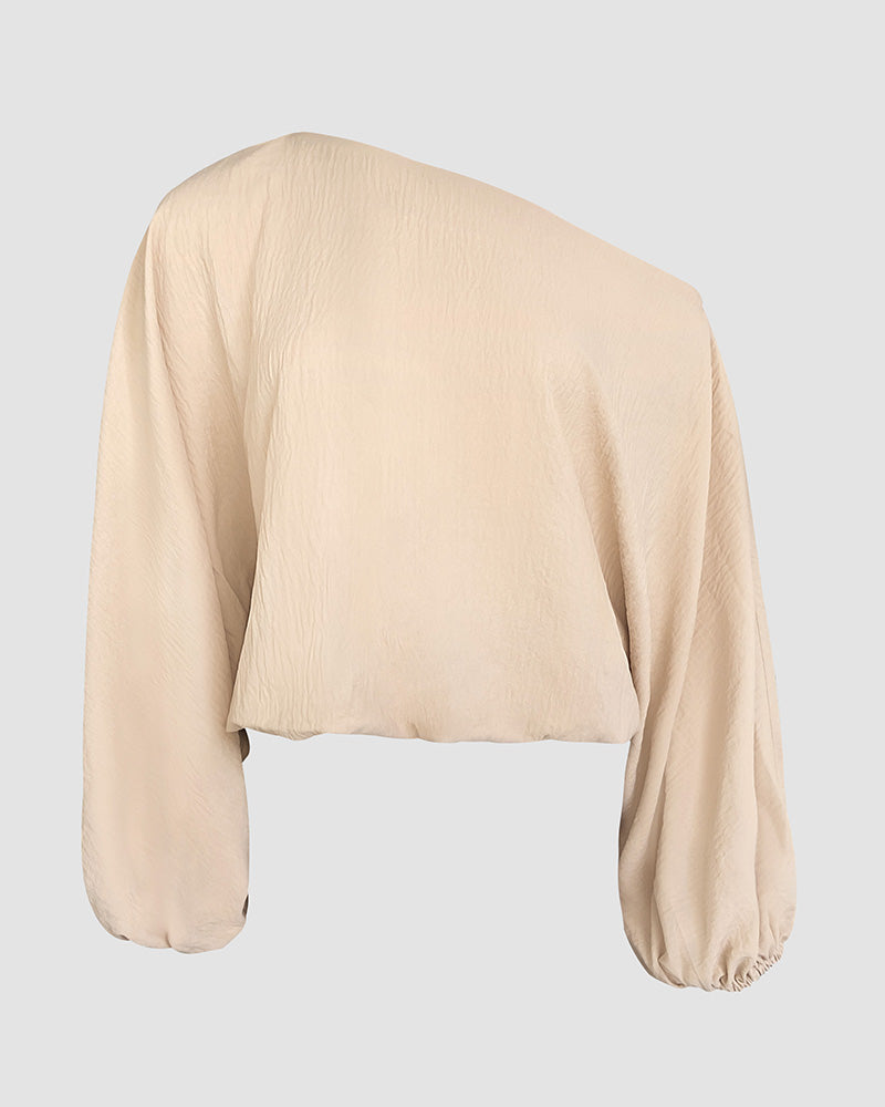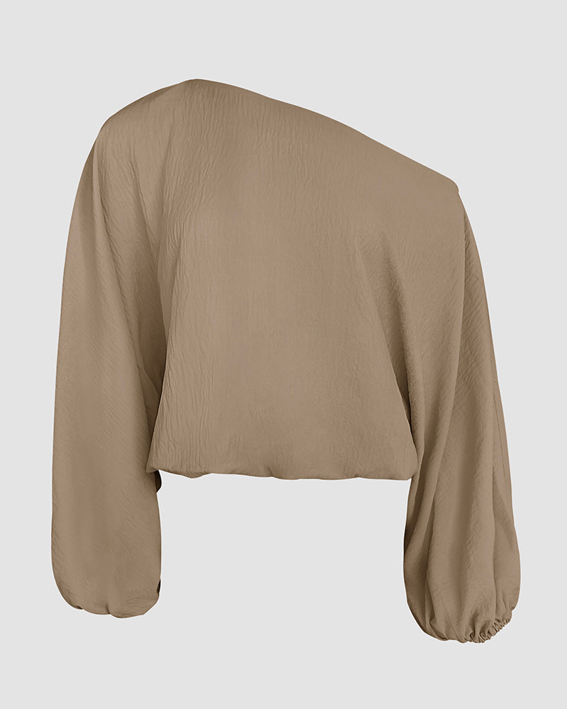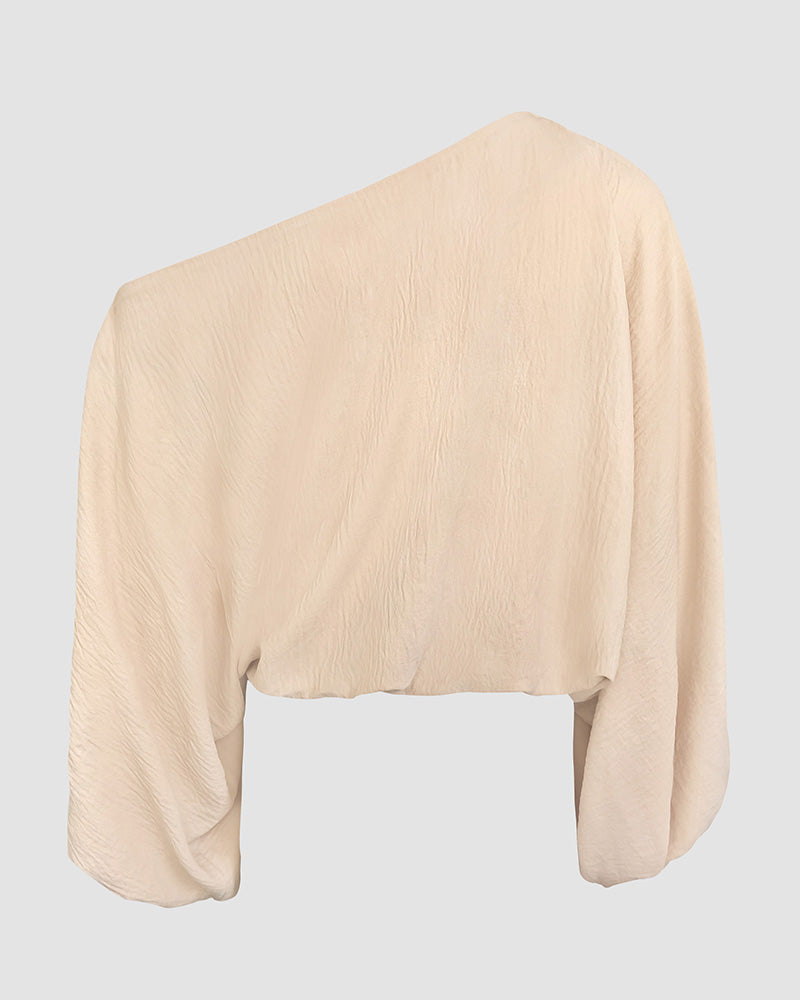 Skew Neck Lantern Sleeve Loose Top & Zipper Fly Wide Leg Pants Set without Belt