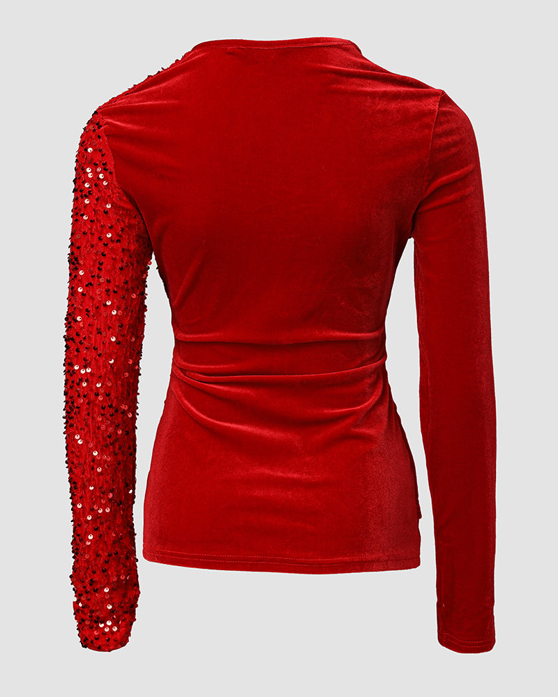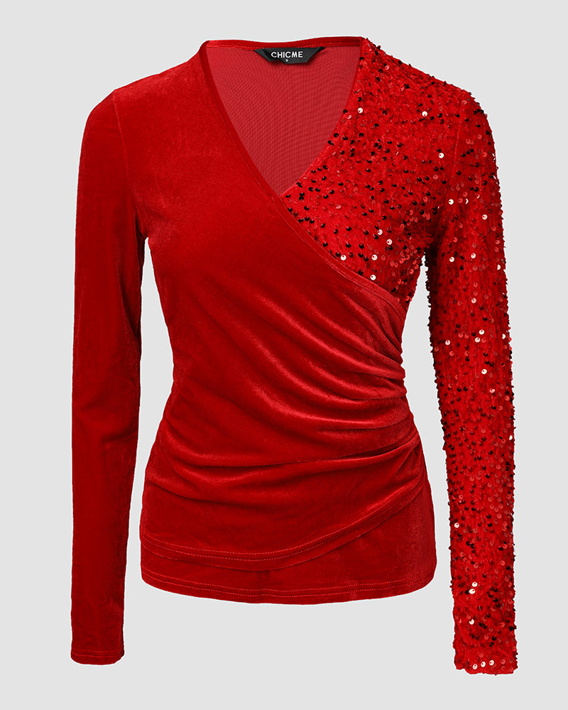 Velvet Contrast Sequin V-Neck Ruched Shirt Crisis Cross Overlap Tee Casual Wrap Top