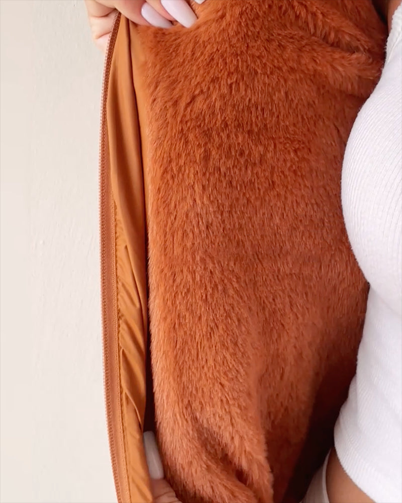 Zipper Pocket Design Shirred Fuzzy Trim Fleece Lined Hooded Puffer Jacket